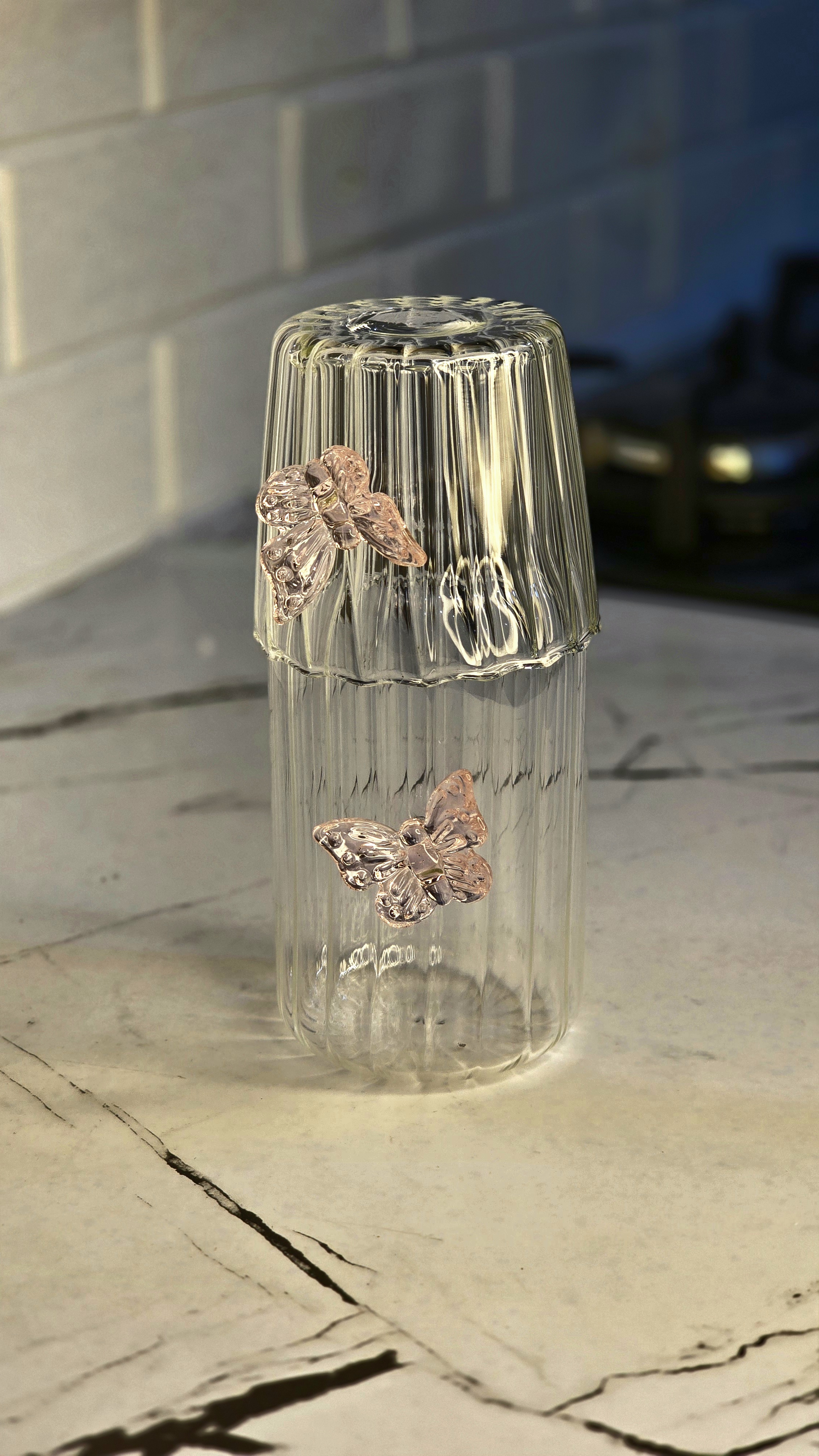 پارچ شب شیشهای طرح پروانه، یک انتخاب شیک و کاربردی برای کنار تخت، اتاق خواب یا میز کار است. این محصول با طراحی شفاف و مدرن، همراه با لیوان همجنس، نیاز شما به نوشیدن آب در طول شب را به راحتی برطرف میکند. تزئین پروانه برجسته روی بدنه، جلوهای ظریف و خاص به محصول میبخشد و آن را به یک آیتم دکوراتیو جذاب تبدیل میکند.
