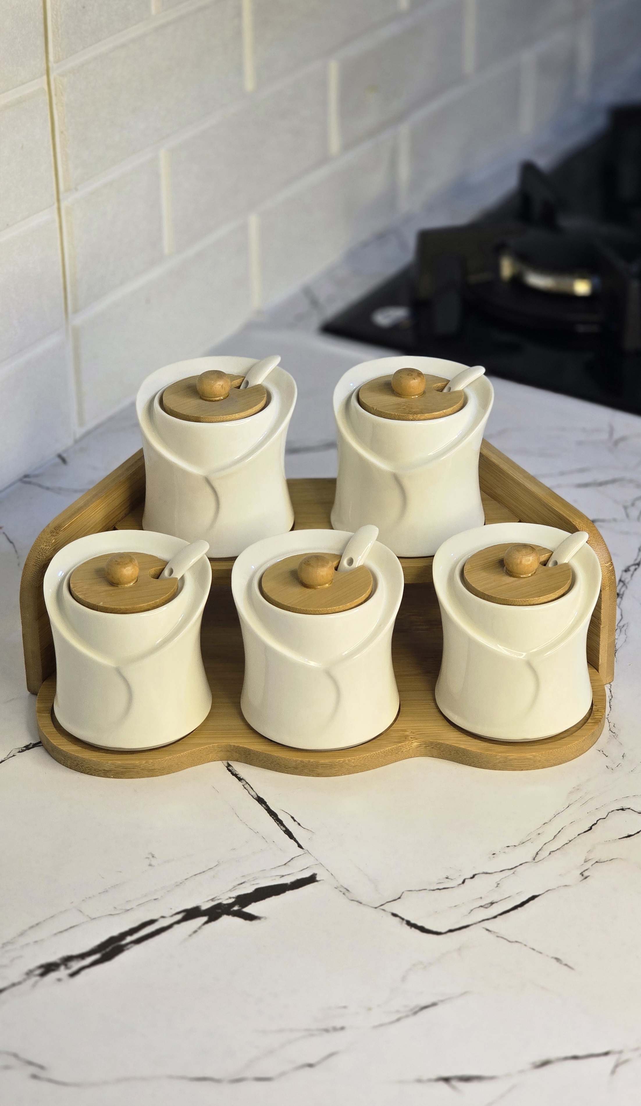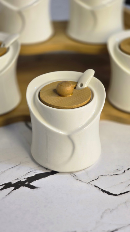 ست پاسماوری سرامیکی با طراحی مدرن و مینیمال، انتخابی شیک و کاربردی برای نظمدهی به آشپزخانه شماست. ترکیب بدنهی سرامیکی سفید با دربهای چوبی، جلوهای گرم و لوکس به فضای آشپزخانه میدهد و برای دکورهای مدرن و کلاسیک کاملاً مناسب است.