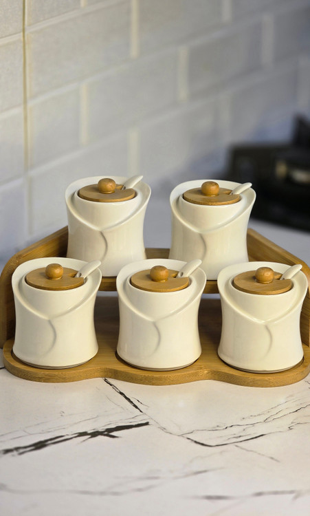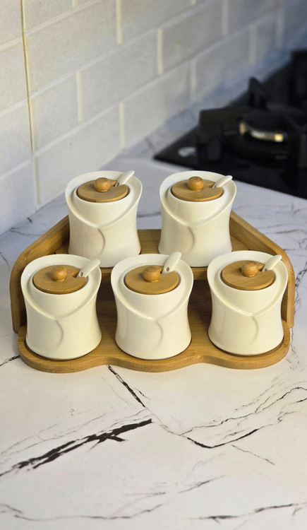 این ست شامل ۵ عدد ظرف پاسماوری به همراه سینی چوبی هماهنگ میباشد و گزینهای عالی برای نگهداری انواع ادویه، شکر، نمک، قهوه، چای و سایر مواد خشک است.