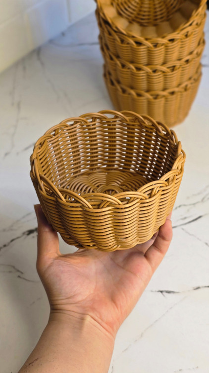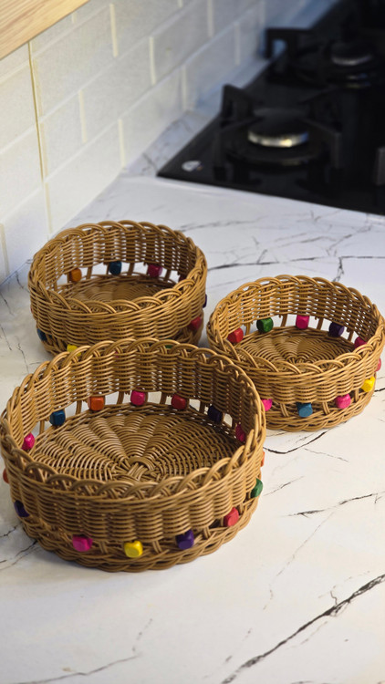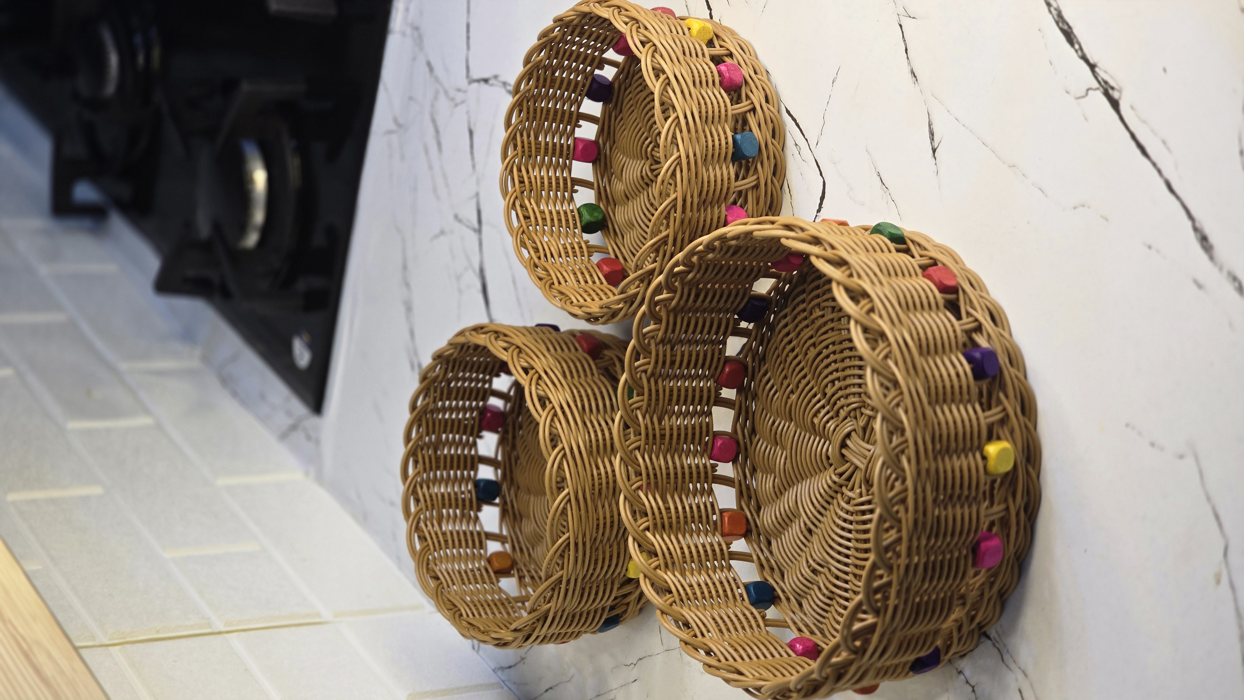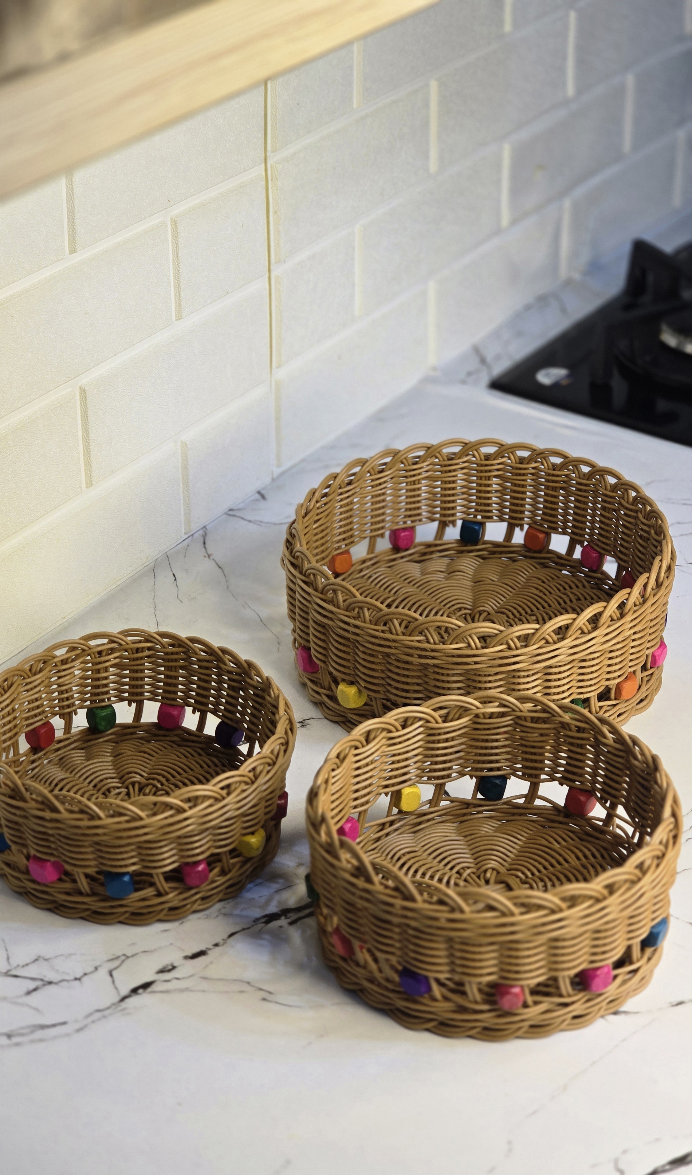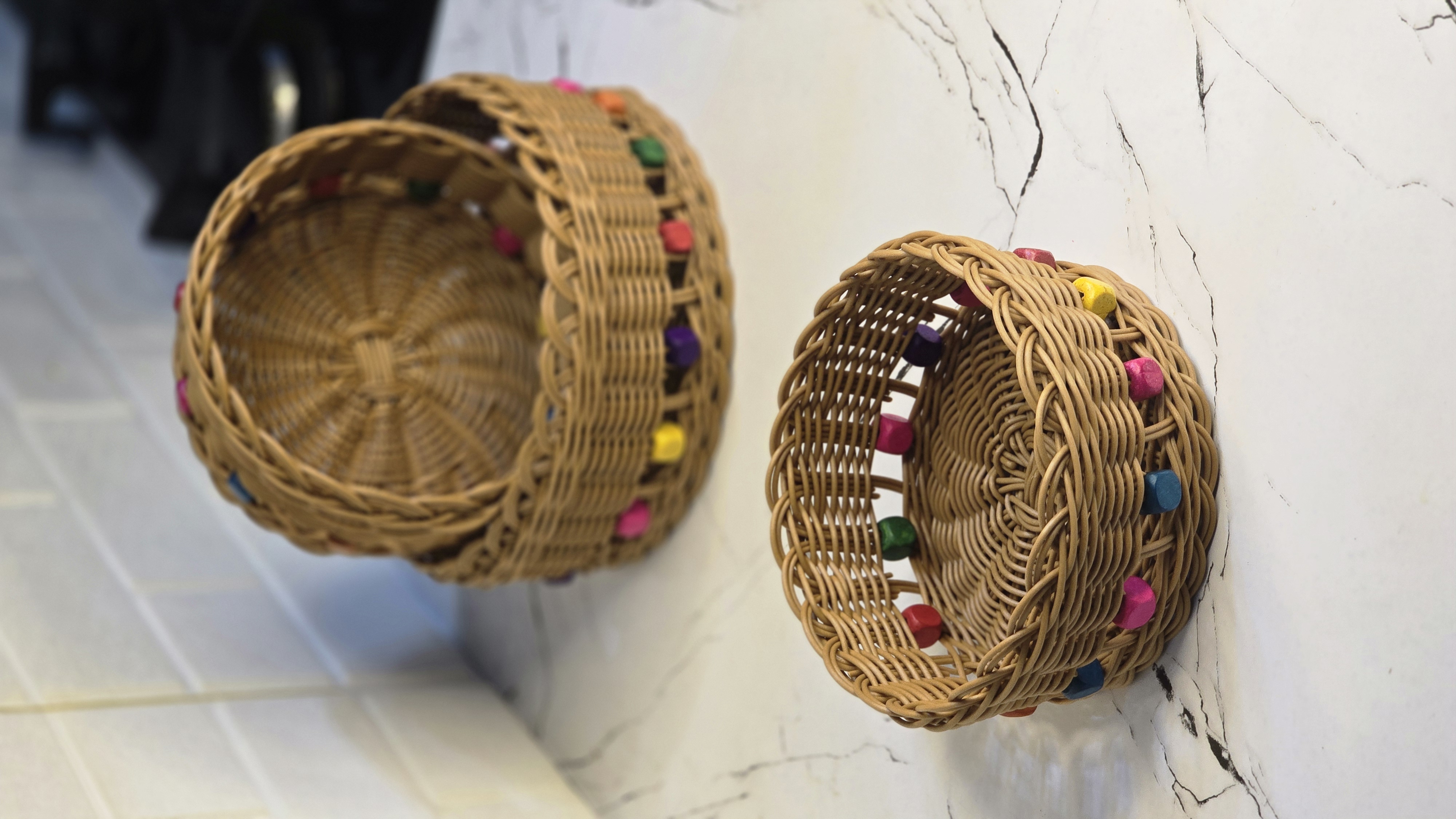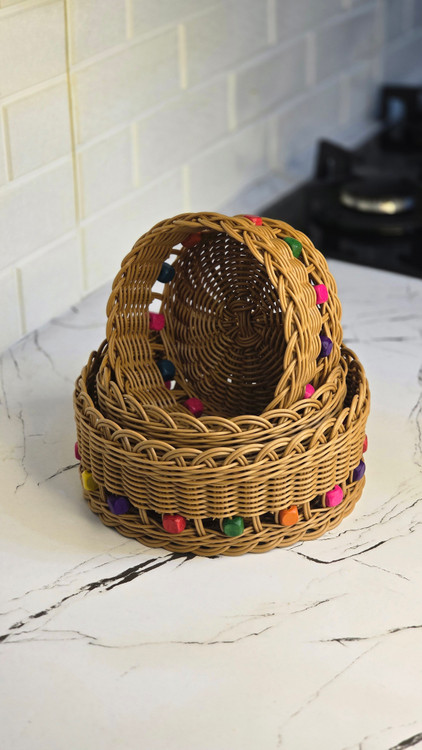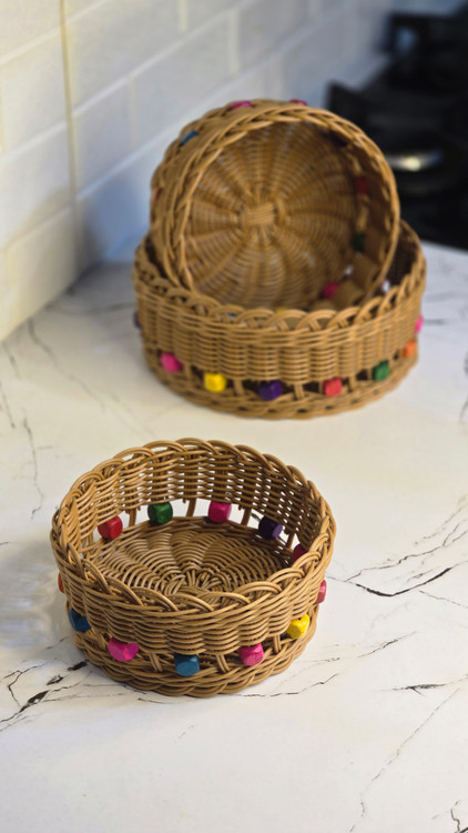 این سبدهای زیبا با طراحی حصیری و تزئین مهرههای رنگی، انتخابی عالی برای نظمدهی و دکوراسیون منزل هستند. ظاهر گرم و دستبافتمانند آنها، حس طبیعی و صمیمی به فضا میدهد و در عین حال از متریال پلاستیکی باکیفیت ساخته شدهاند که سبک، بادوام و قابل شستوشو هستند.