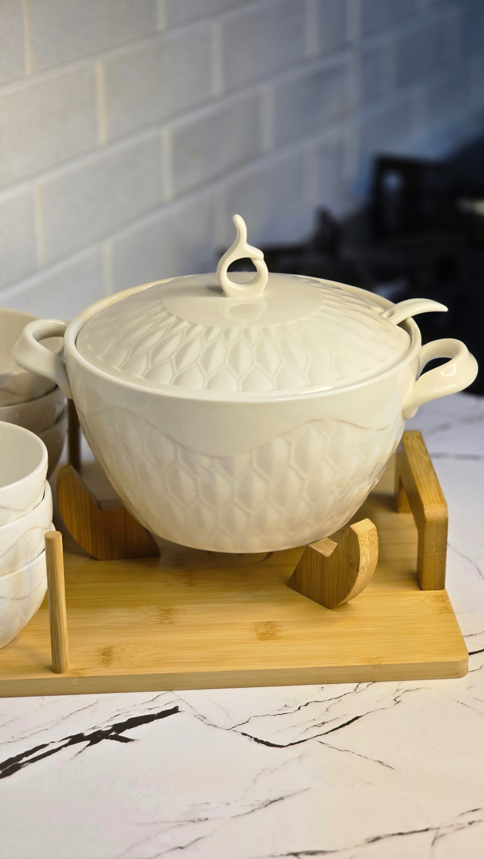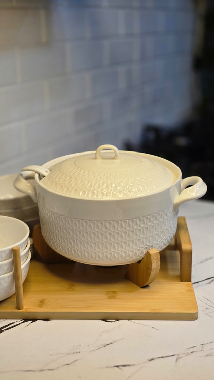 یک ست پذیرایی شیک و کاربردی که با ترکیب سرامیک سفید طرحدار و استند چوب طبیعی، جلوهای گرم و مدرن به میز غذاخوری شما میدهد. این ست انتخابی عالی برای سرو سوپ، آش، خوراک و غذاهای گرم در مهمانیها و دورهمیهای خانوادگی است.