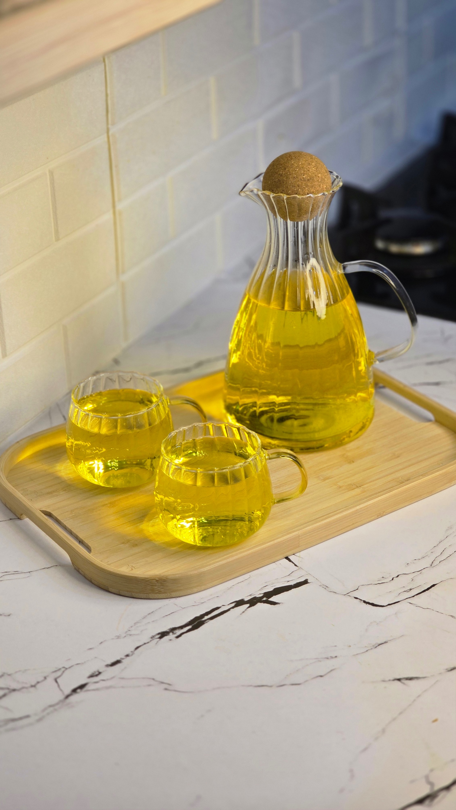 پارچ با بدنه شیشهای شفاف و طراحی شیاردار ظریف، جلوهای زیبا و متفاوت به میز پذیرایی شما میبخشد. درب چوبپنبهای علاوه بر زیبایی، از ورود گرد و غبار جلوگیری کرده و نوشیدنی را تازه نگه میدارد. لیوانهای هماهنگ با طراحی یکدست، این ست را کامل و چشمنواز کردهاند.