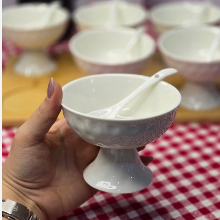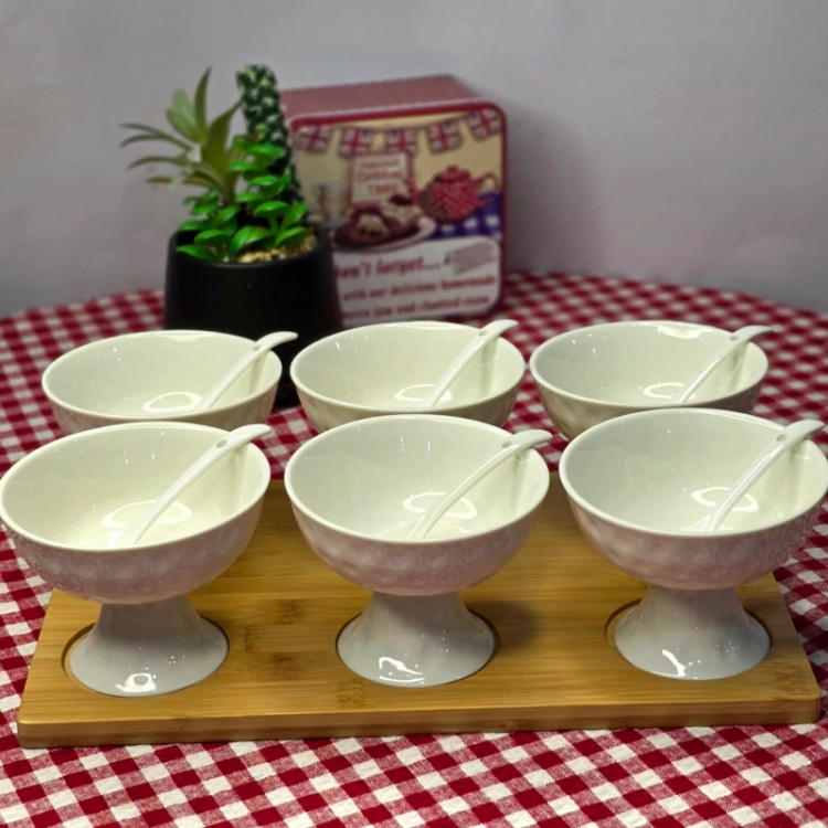 ست 6عددی کاسه پایه دار چینی و سینی بامبو